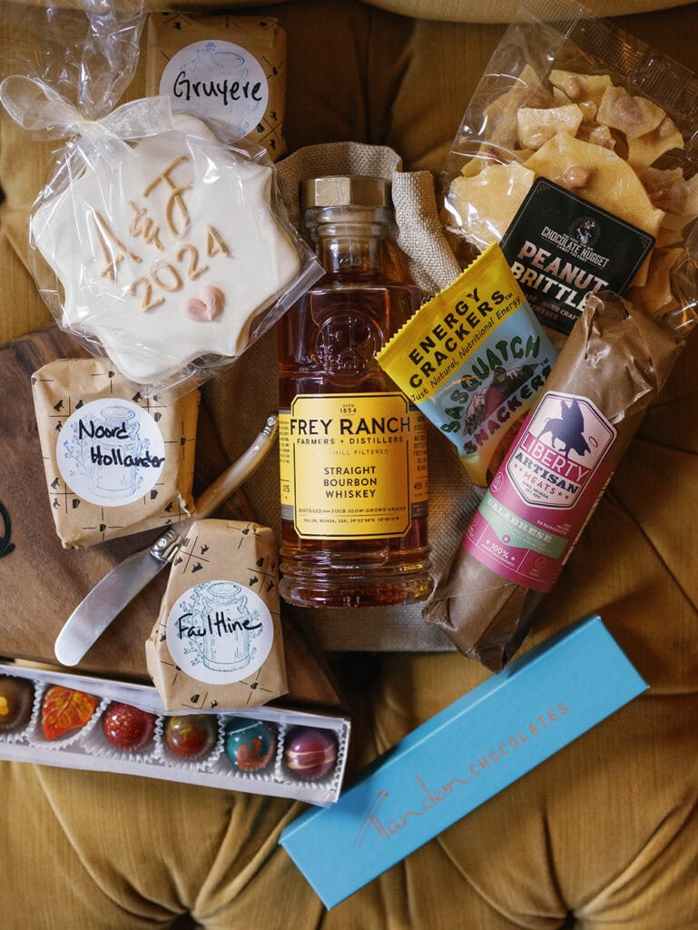 We carefully curated our memorable welcome baskets for guestsโ rooms. They contained a hand-milled, Nevada-shaped, heirloom walnut cutting board created by Wendy Baroli at Wren Wood Studio in Reno; a trio of cheeses from The Wheyfarer Cheese and Specialty Foods in Reno; handcrafted salami from Liberty Artisan Meats in Reno; handmade sugar cookies from Mix Bakeshop in Reno; handcrafted, ethically sourced chocolates from Tandem Chocolates in Reno; peanut brittle from Chocolate Nugget Candy Factory in Reno; award-winning estate whiskey from Frey Ranch Farmers + Distillers in Fallon; freshly made crackers from Sasquatch Snackers in Reno; and a Laguiole cheese knife.
