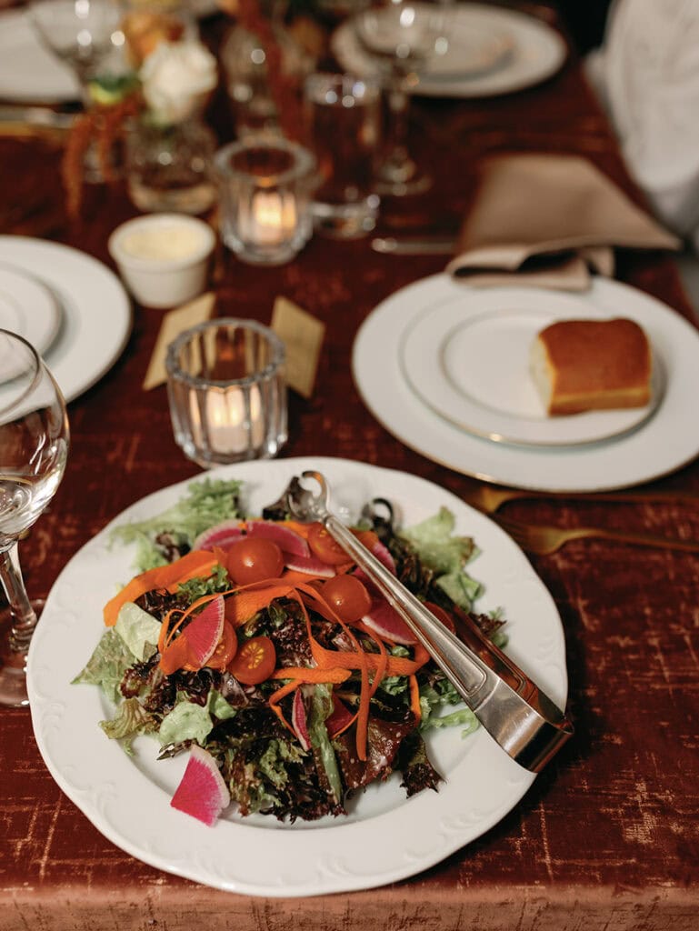 Following the ceremony, we moved into the reception hall for Manhattans, Aperol spritzes, glasses of cava, and conversation. For our sit-down dinner, we chose family-style service so guests could share food and chat while passing dishes. We started with a locally sourced green salad with shaved vegetables in a Champagne vinaigrette. Main courses included Skuna Bay salmon with a beurre blanc sauce and Wagyu bavette steak with a rosemary au jus. Sides featured Brussels sprouts with pickled Fresno sauce, fried garlic, and mint; colcannon (mashed potatoes with kale and green onions); and roasted seasonal vegetables with fresh herbs.