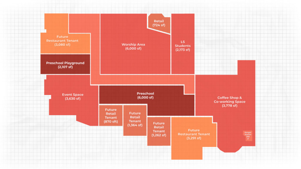 While the main operation will be Sunday services and meeting rooms for church business and activities, Craig Parish says the plans are much larger than that. The goal is to create a multi-use community gathering space useable seven days per week. While no leases have been signed yet, the plans submitted to the City of Reno for approval include two street-level restaurants, an expanded outdoor patio, and a large coffee shop/co-working space. Parish says church leaders are already in talks with some potential businesses, including a brewery, but are also entertaining all potential tenants at this time. Interested parties can submit a tenant interest form to inquire about the open spots, which are proposed as a 3,080-square-foot restaurant, 3,291-square-foot restaurant, and 3,778-square-foot coffee shop, pending city approval.