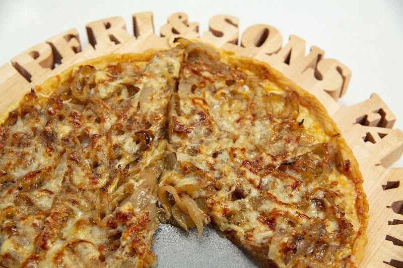 - Bake in preheated 375 degrees F oven until crust is firm and golden and onions have turned a rich golden brown, without blackening, about 30 minutes. Remove and cool slightly. Serve slightly warm or at room temperature garnished with thyme sprigs.