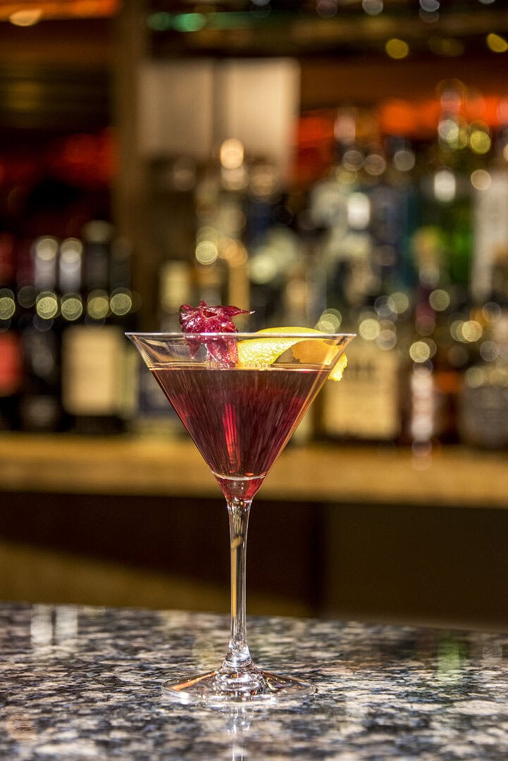 - Prepare a chilled coupe glass. In a mixing glass, combine whiskey, sweet vermouth, hibiscus syrup, and bitters. Add ice and stir. Strain into chilled coupe glass. Twist an orange peel to expel its oils over the cocktail. Garnish drink with peel and flower.