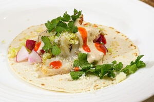 A corn tortilla is the traditional base for fish tacos (but flour can be used in a pinch). Jenny suggests warming them on a comal or other cast-iron pan. However, they also can be heated directly over a gas stove burner, which allows a nice char to form in spots and adds to the authenticity. If employing this method, she suggests turning often to ensure the tortillas donโt burn.