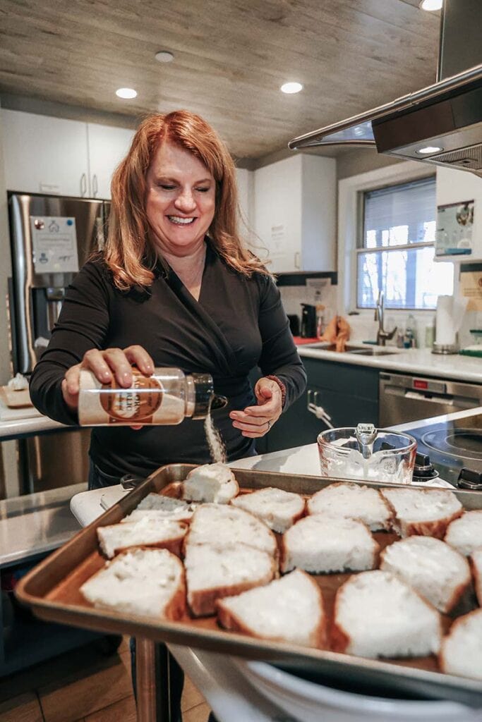 Volunteer cook Susan Thompson seasons garlic bread. Photo by Shaun Hunter