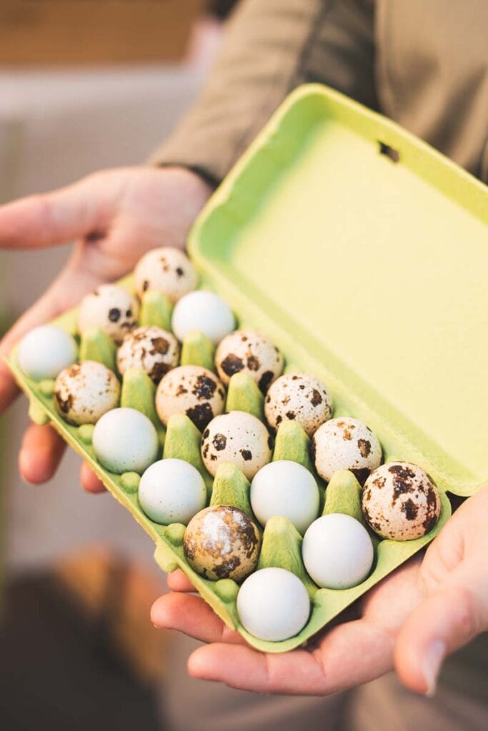 โMy favorite way to use up a ton of eggs is to boil, peel, and then marinate the eggs in a soy sauce, sugar, garlic, green onion, chili, and sesame seed concoction and eat that with rice,โ Hehnke says. โI also started making homemade mayo with quail eggs.โ