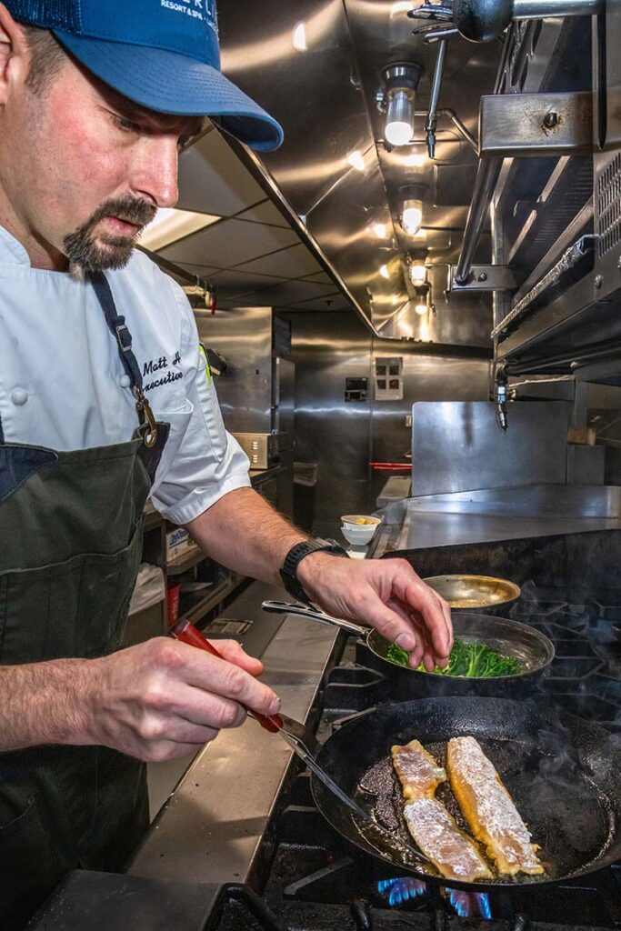 Executive chef Matt Hale of Six Peaks Grille at Everline Resort prepares a guestโ€™s freshly caught rainbow trout. Photo by Scott Thompson