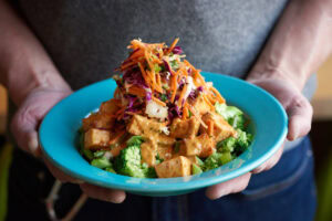 - In each bowl, serve ยพ cup cooked brown rice. Top with 3 ounces (about ยผ cup) broccoli, followed by 2 ounces sautรฉed green beans, 3 ounces baked tofu or grilled chicken, then 6 tablespoons peanut sauce. Finish with ยฝ cup cilantro-lime slaw.
