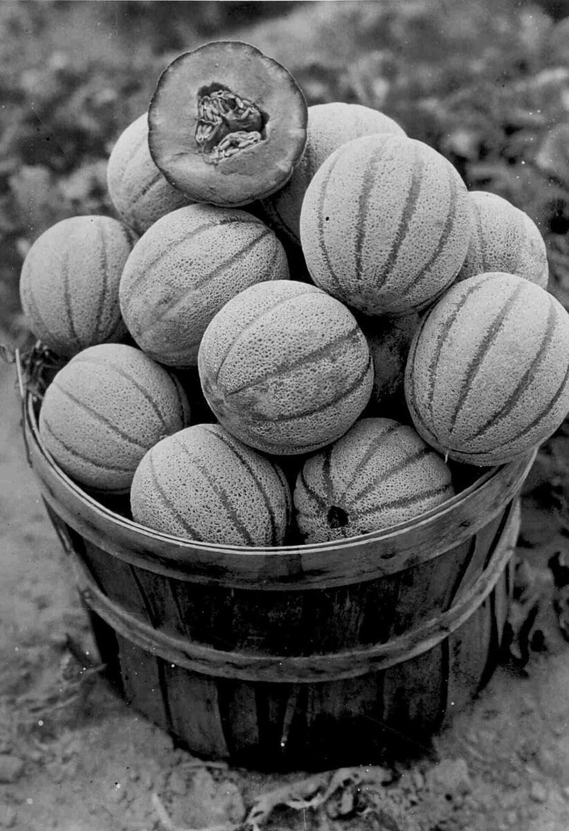 A bushel of melons ready for the market in the 1920s. Swingle Bench was the pioneering location for the Hearts of Gold variety