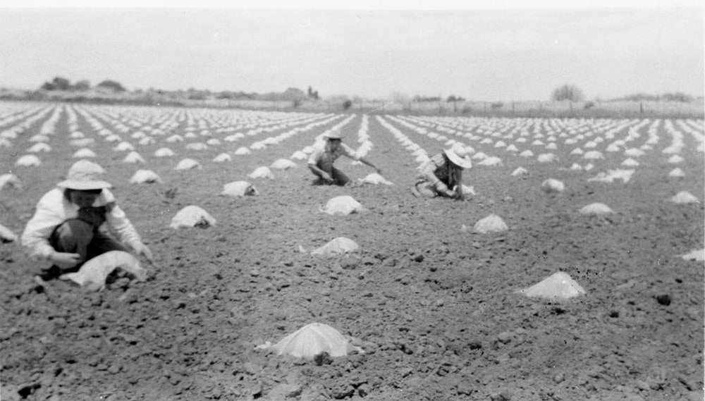 Field workers place the melons under the paper โ€œhot capsโ€ in spring of 1941, at the Ito-Kito Ranch located at 955 St. Clair Road in Fallon
