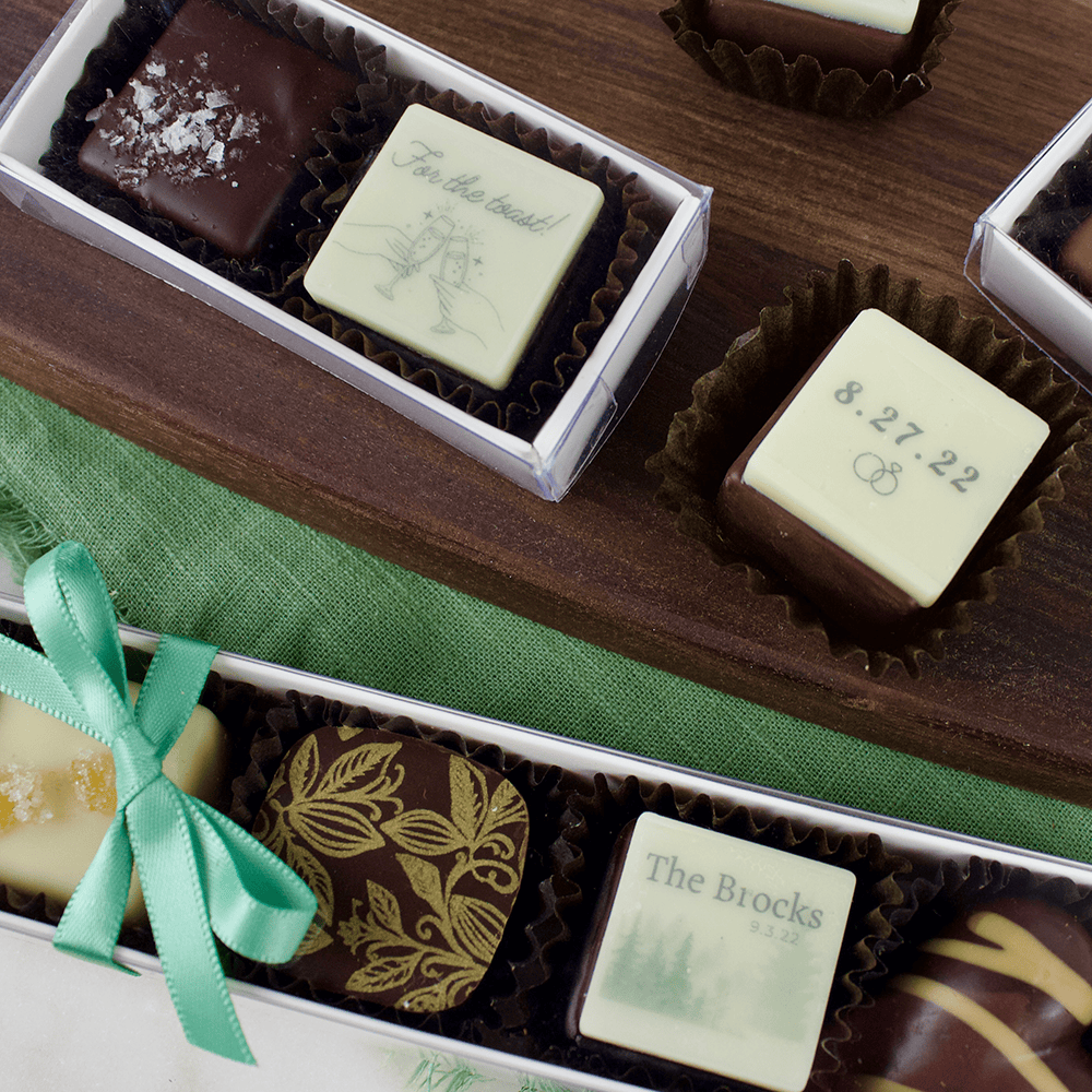 Yes! We can feature a logo or graphic design printed with edible cocoa butter ink directly onto the chocolate! Initials, a special date, or even a drawing of a pet, the possibilities are endless! This graphic design can be something that the client provides, or we would be happy to design one for you!