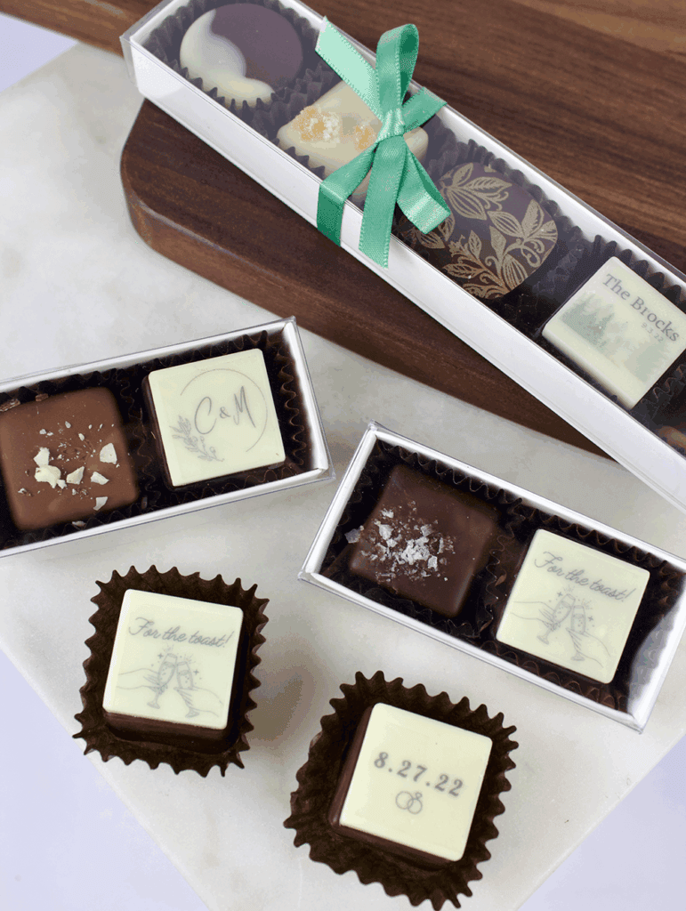 Luxury handcrafted french chocolates for a beautiful dessert spread or for personalized wedding favors and Bridal party gifts!